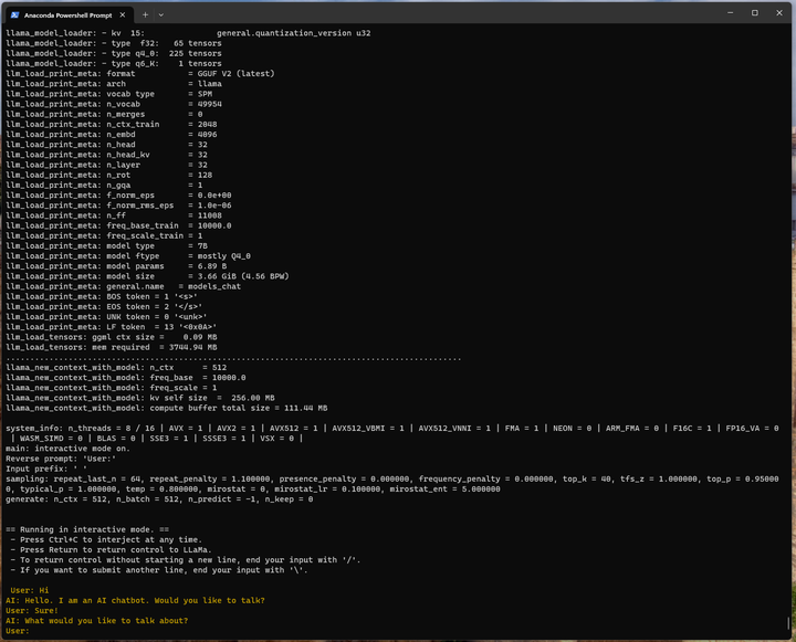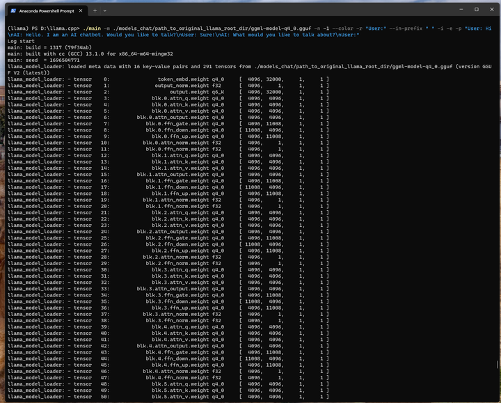 ./main -m ./models_chat/path_to_original_llama_root_dir/ggml-model-q4_0.gguf -n -1 --color -r "User:" --in-prefix " " -i -e -p "User: Hi\nAI: Hello. I am an AI chatbot. Would you like to talk?\nUser: Sure!\nAI: What would you like to talk about?\nUser:"