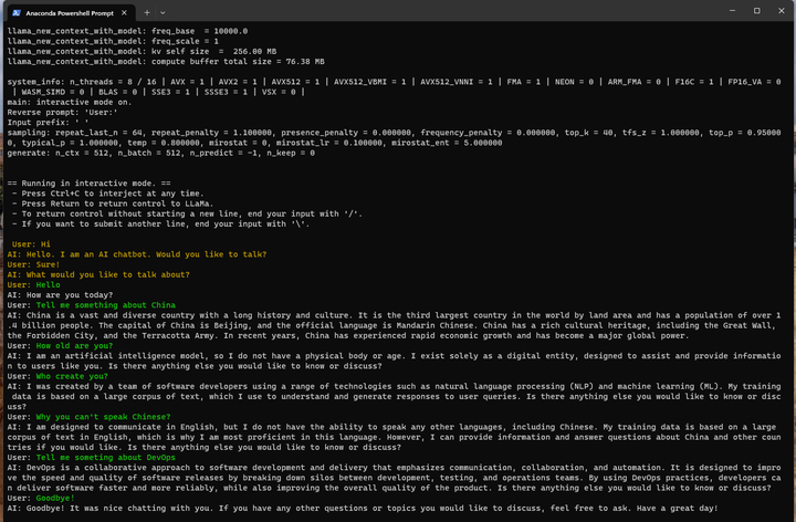 ./main -m ./models_chat/path_to_output_dir/ggml-model-q4_0.gguf -n -1 --color -r "User:" --in-prefix " " -i -e -p "User: Hi\nAI: Hello. I am an AI chatbot. Would you like to talk?\nUser: Sure!\nAI: What would you like to talk about?\nUser:"