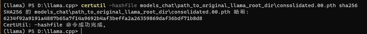 (llama) PS D:\llama.cpp> certutil -hashfile models_chat\path_to_output_dir\consolidated.00.pth sha256