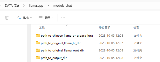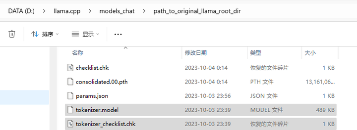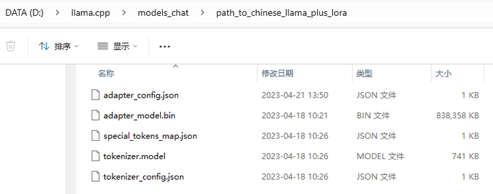 将 models/chinese_llama_plus_lora_7b 目录下的模型复制到 D:\llama.cpp\models_chat\path_to_chinese_llama_plus_lora 目录下: