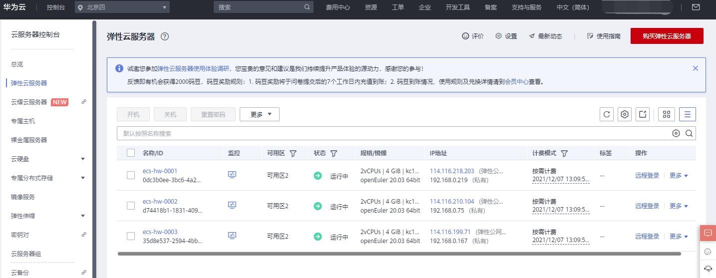 1. 购买三台华为鲲鹏云服务器及必要的网络资源,参照“二、 实验环境配置”中的“1. 购买华为鲲鹏云服务器”; 注意请参照本文档配置购买资源,不要购买价格较高的额外资源;