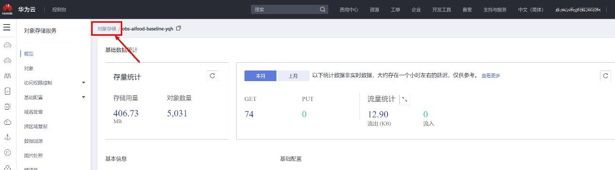 如“对象存储服务 OBS”服务所实例,进入“管理”界面后,点击服务名称的上一级目录入口,进入服务控制台。如下图所示: