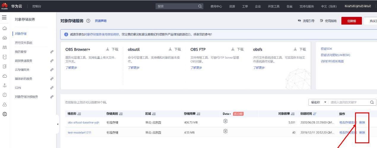 对各 OBS 实例逐个进行“删除”操作。OBS 实例桶中如果有数据,需先清除,具体参考提示操作即可。如下图所示: