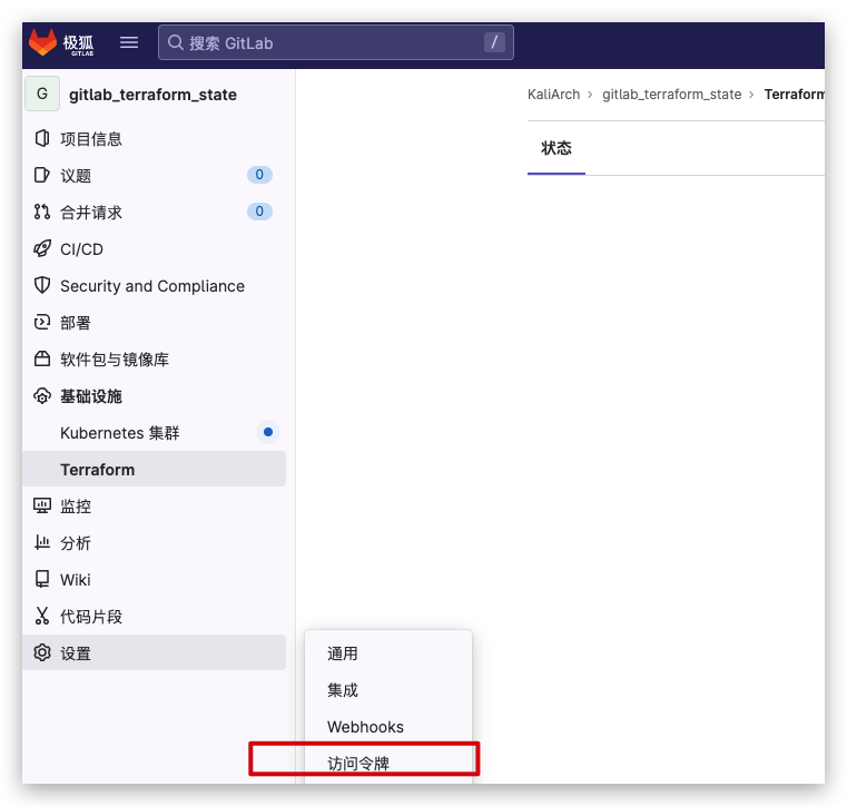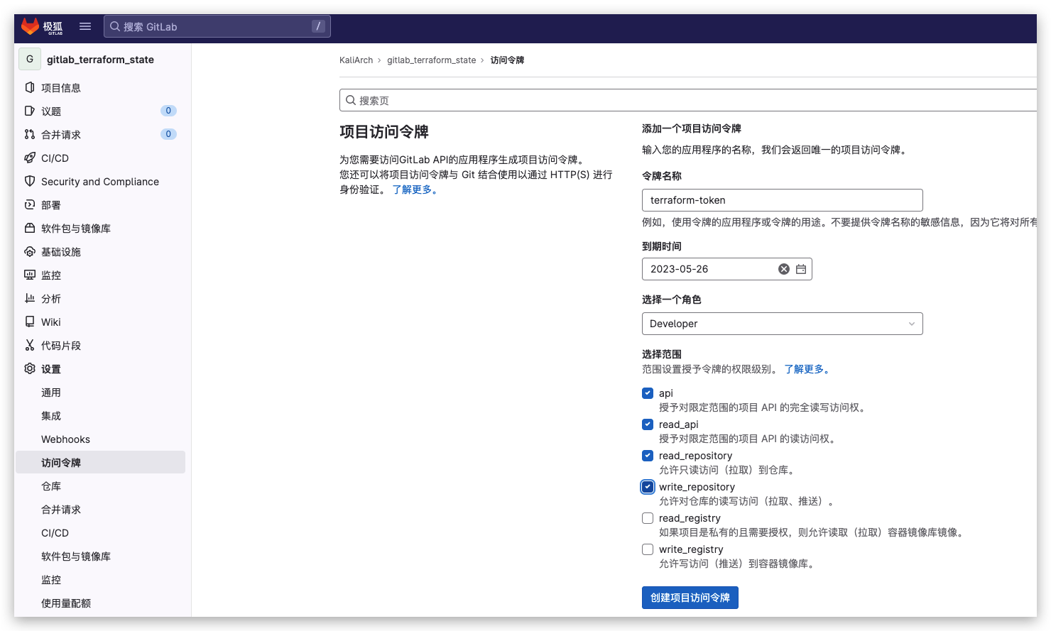 创建对应权限的token,后期用于tf配置认证Gitlab进行state状态文件存储。