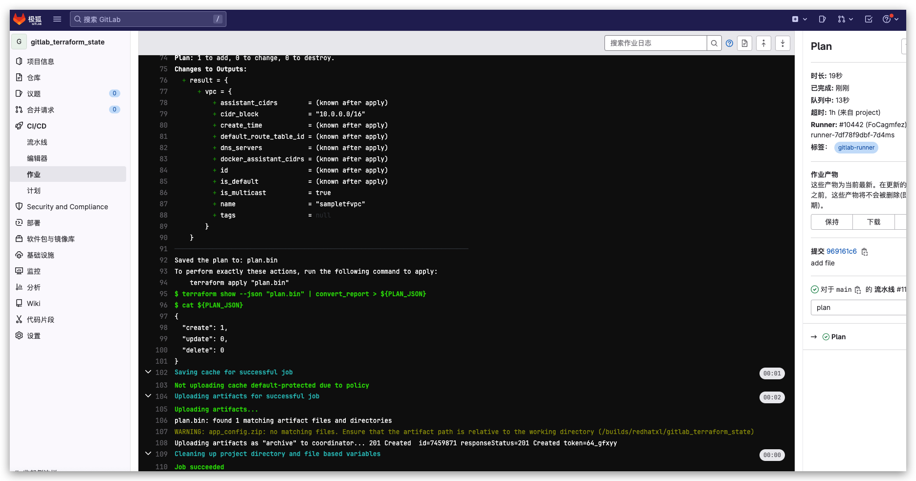 同样的可以使用极狐Gitlab后端 作为terraform的远端数据源,使用 data.terraform_remote_state.example.outputs.<OUTPUT-NAME> 在 Terraform 资源中引用数据源的输出。
