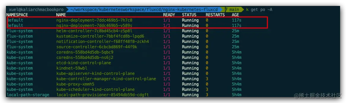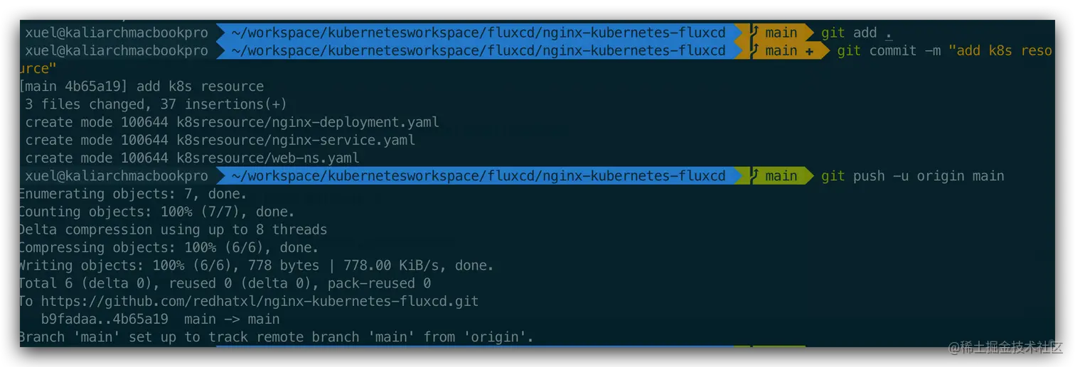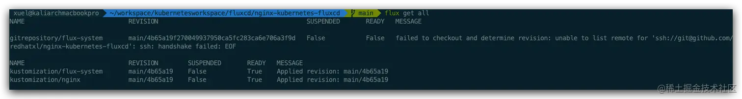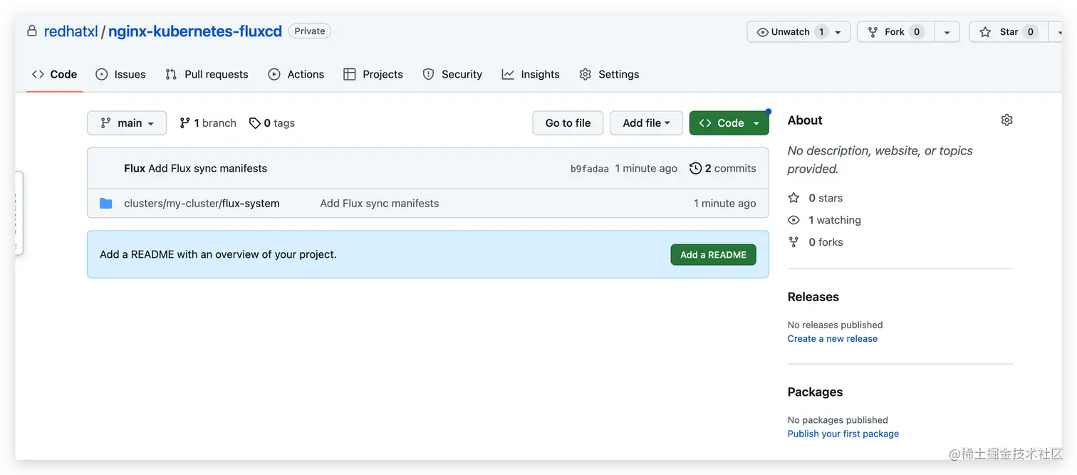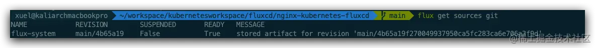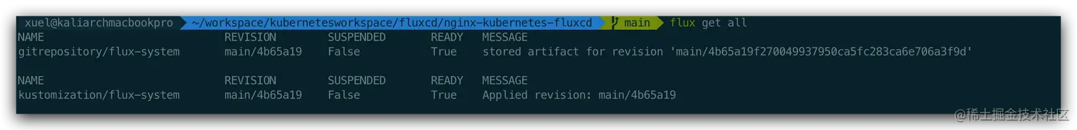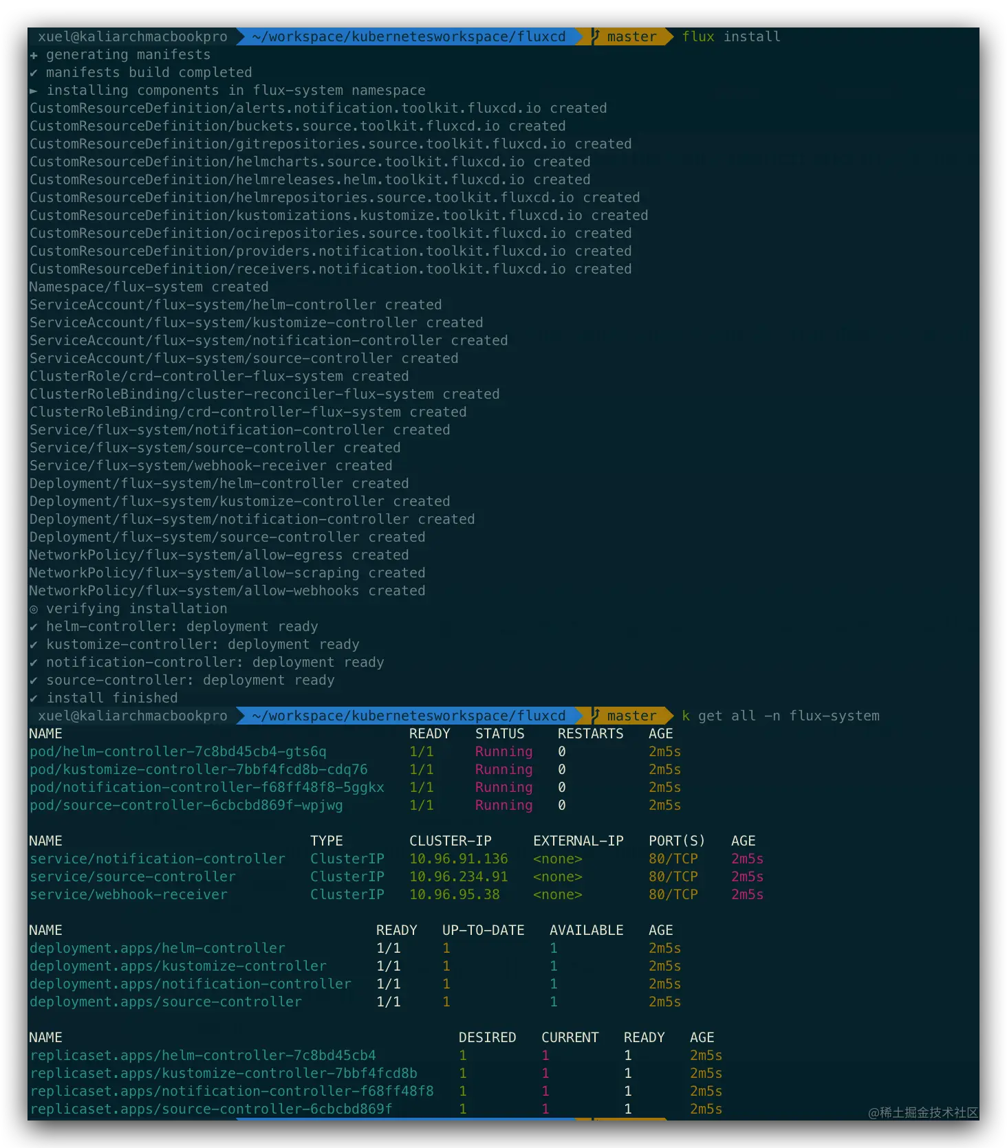 可以看到已成功在github创建对应repo并在k8s集群内安装flux对应控制器