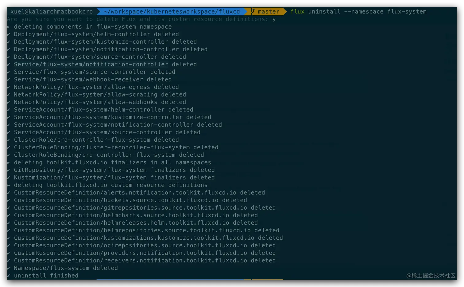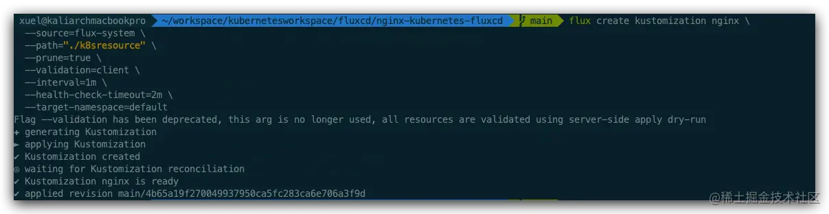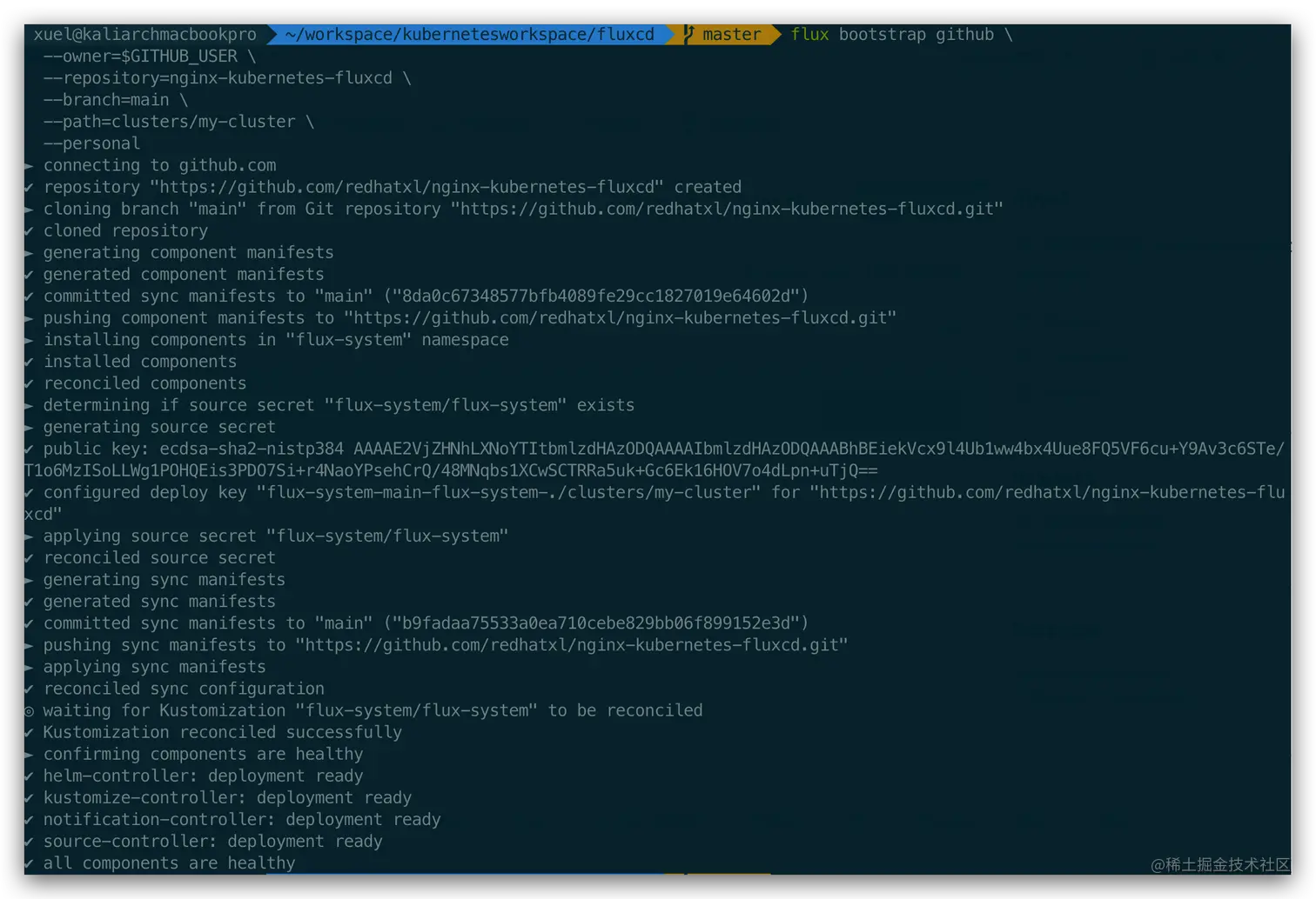 在GHUSER环境变量中提供你的GitHub用户名,在GHREPO环境变量中提供GitHub repo,如下所示。创建一个名为flux的新名称空间,并在Kubernetes集群中安装flux CD操作符。 fluxctl install命令根据以下选项生成所需的Kubernetes清单: