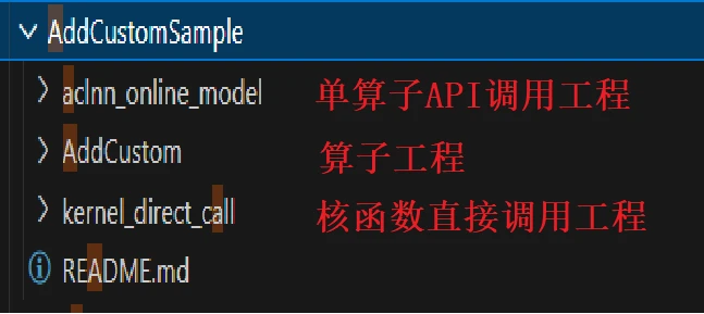 AddCustomSample算子下面有3个目录:算子工程、单算子API调用工程、核函数直接调用工程。
