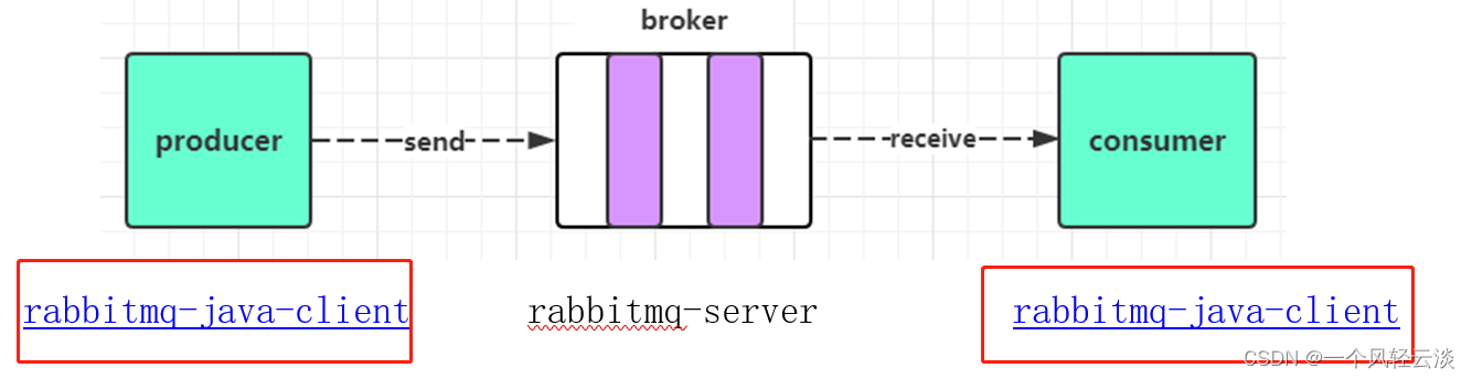 生产者发送消息到消息服务器,然后消费者从消息代理(消息队列)中获取数据并进行处理;
