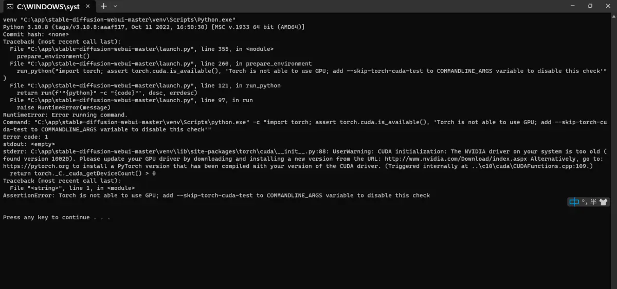 stderr: C:\app\stable-diffusion-webui-master\venv\lib\site-packages\torch\cuda_init_ py:88: UserWarning: CUDA initialization: The NVIDIA driver on your systen is too old (found version 10020). Please update your GPU driver by downloading and installing a new version from the URL: http://www.nvidia.com/Download/index.aspx Alternatively, go to:https://pytorch.org to install a PyTorch version that has been compiled with your version of the CUDA driver. (Triggered internally at …\c10\cuda\CUDAFunctions.cpp:109.)