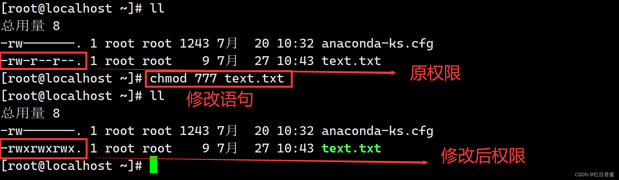 其中,g表示文件所属组,r表示读权限。最后,您可以使用数字表示法来更改文件的权限。例如,要将文件的所有者权限设置为读、写和执行,可以使用以下命令: