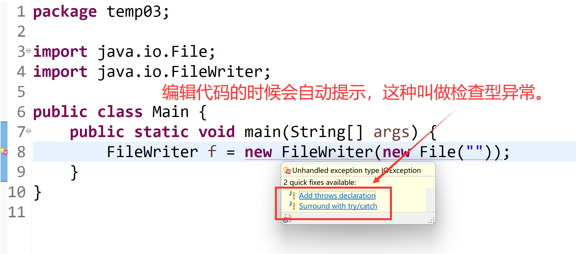 在调用readFile方法时,调用者必须要么处理该异常,要么继续向上层方法传递。