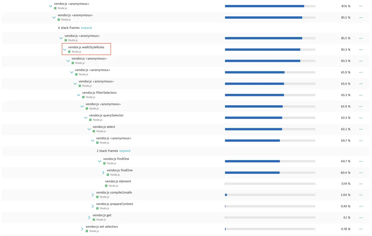 有一个客户启用了 Angular Server Side Rendering,并且启用了 inlineCriticalCss,后来发现在 Dynatrace 的 hotspot 里的 vendor.js 文件有个名叫 walkStyleRules 的函数,耗时比较多。如下图所示: