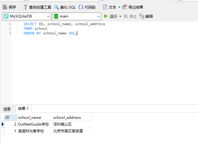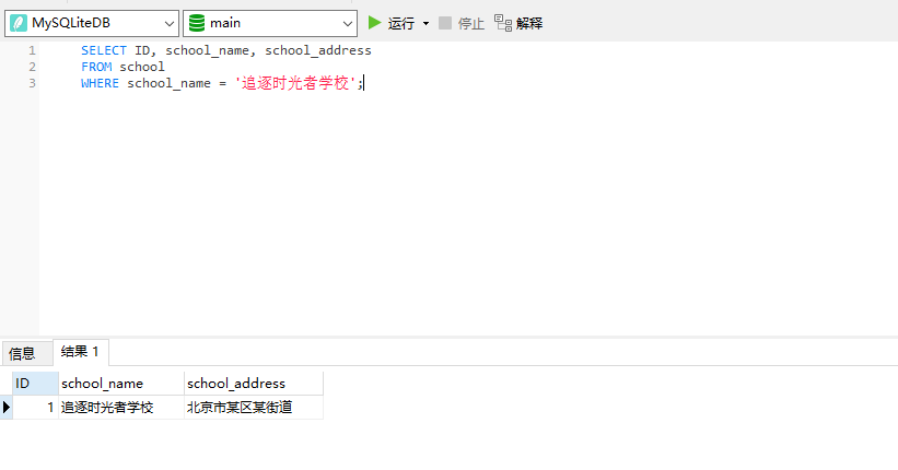 VALUES (1, '追逐时光者学校', '北京市某区某街道');