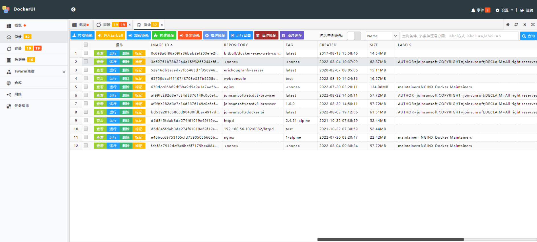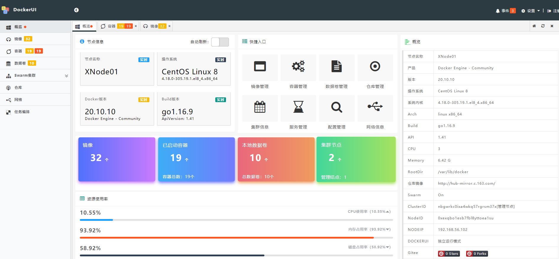 DockerUI是一个易于使用且轻量级的Docker管理工具。通过Web界面的操作,可以更方便地让不熟悉Docker指令的用户更快地进入Docker世界。DockerUI覆盖了Docker CLI命令行的95%以上的命令功能。通过DockerUI界面提供的可视化操作功能,可以轻松执行Docker环境和Docker Swarm群集环境的管理和维护功能。