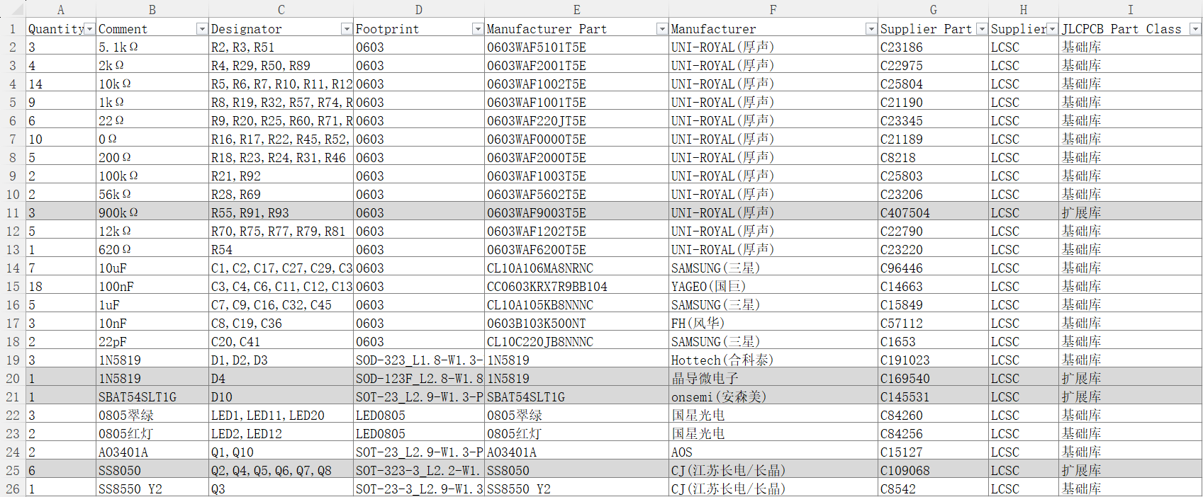 2、阻容元器件均使用0603封装,LED使用0805封装,便于自己制作时进行焊接