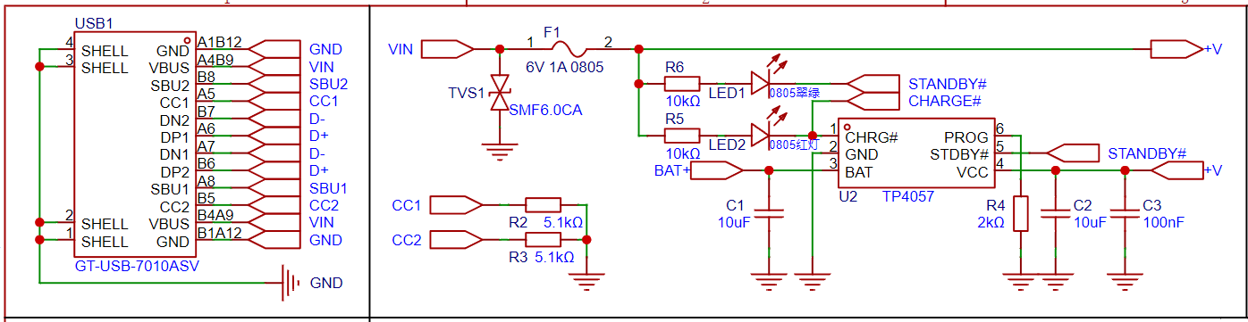 在充电ic部分我选择了常用的TP4057作为主控,电源输入采用了最常见的Type-C接口,虽然在本项目中实用6P接口就已经足够,但考虑到项目扩展性,因此选择了16P接口,并借用了Type-C接口中的SBU1、SBU2引脚进行扩展板连接,之所以没有使用D+D-作为扩展线路,是因为考虑到设备的输出信号可能使得充电器误判,从而发出错误电压造成危险,这在设计中是需要考虑到的。
