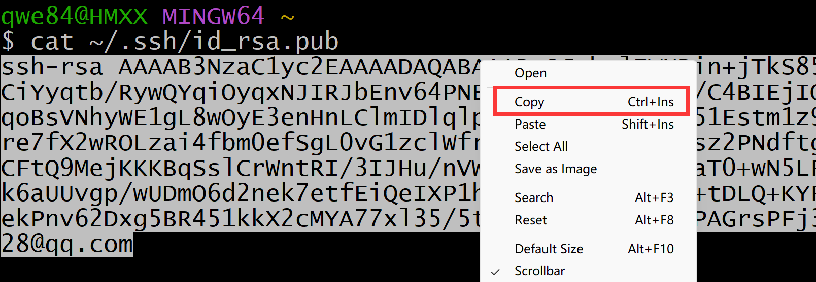 鼠标选中公钥,这里需要使用鼠标右键来点击【copy】来复制。