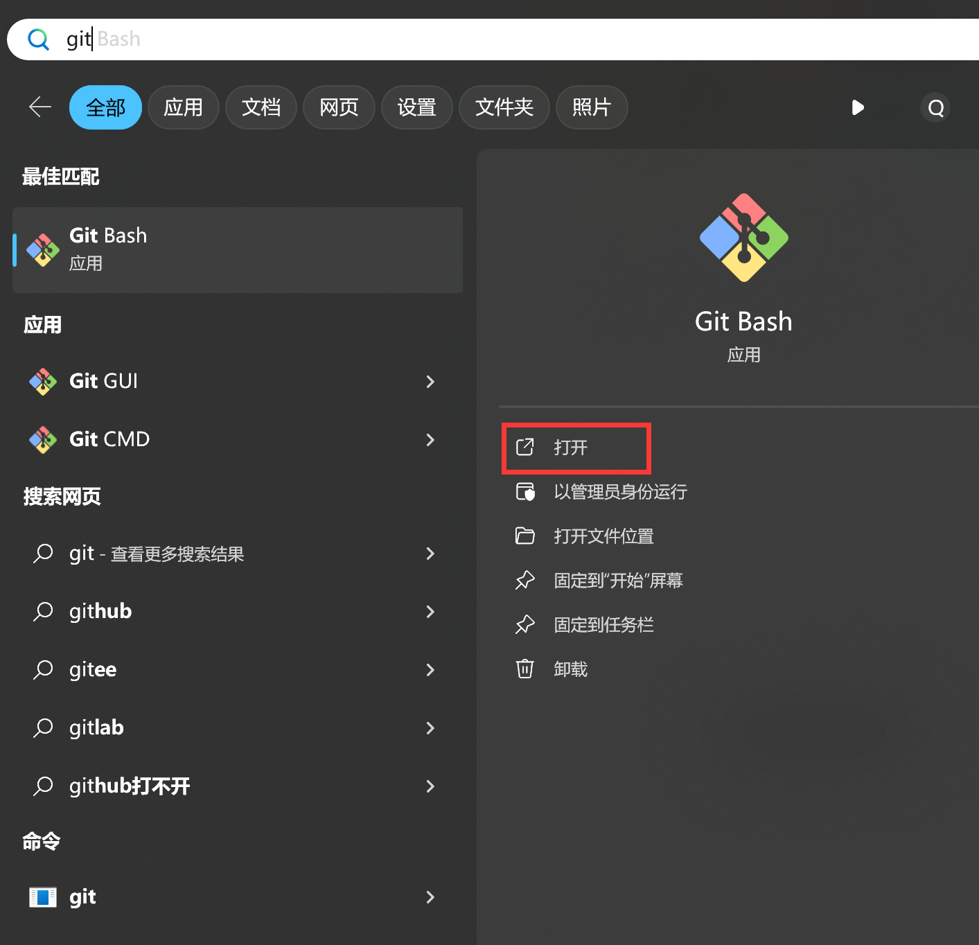 安装完毕后可以点击键盘上的【田】也就是开始菜单按钮,输入git就可以看到git的命令行操作窗口了。