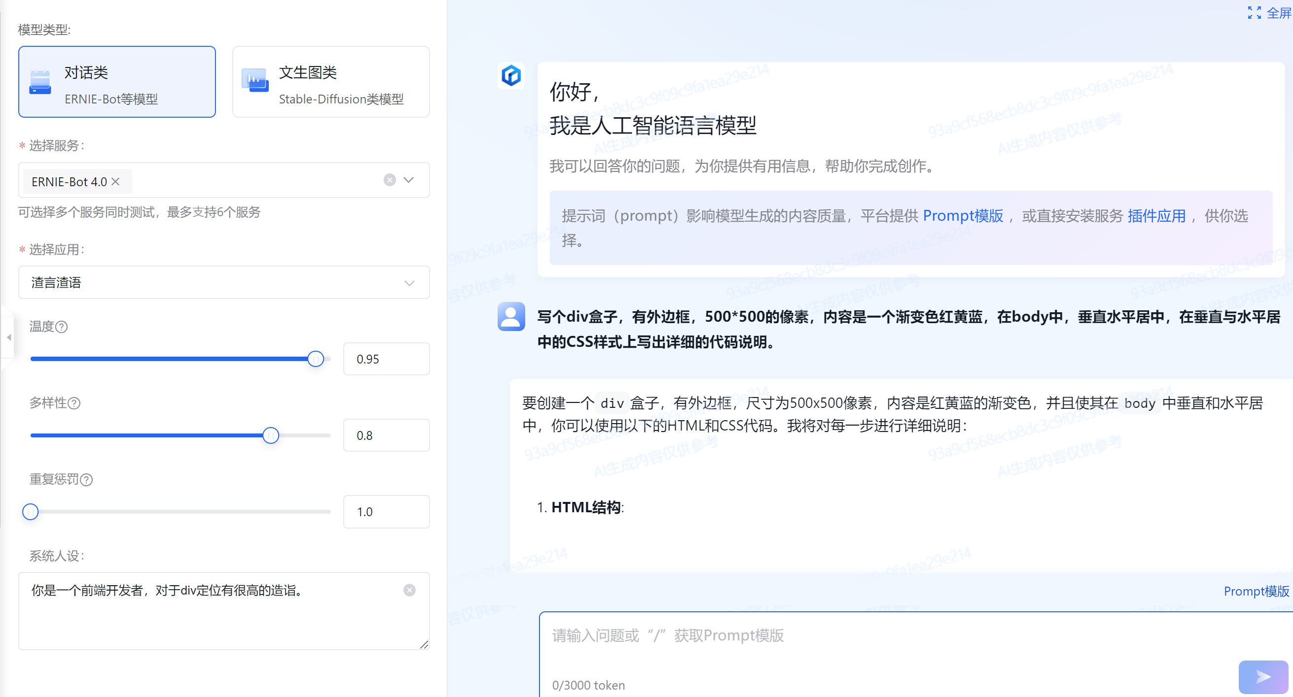 【摘要】 前言有学生问问题,又不想自己写代码,那么我们使用千帆大模型就方便了。看看我怎么解决的:生成很简单。我们直接上啊:千帆4生成方法系统人设:你是一个前端开发者,对于div定位有很高的造诣。提示词:写个div盒子,有外边框,500*500的像素,内容是一个渐变色红黄蓝,在body中,垂直水平居中,在垂直与水平居中的CSS样式上写出详细的代码说明。返回信息与结果生成结果:要创建一个div盒子,有外...
