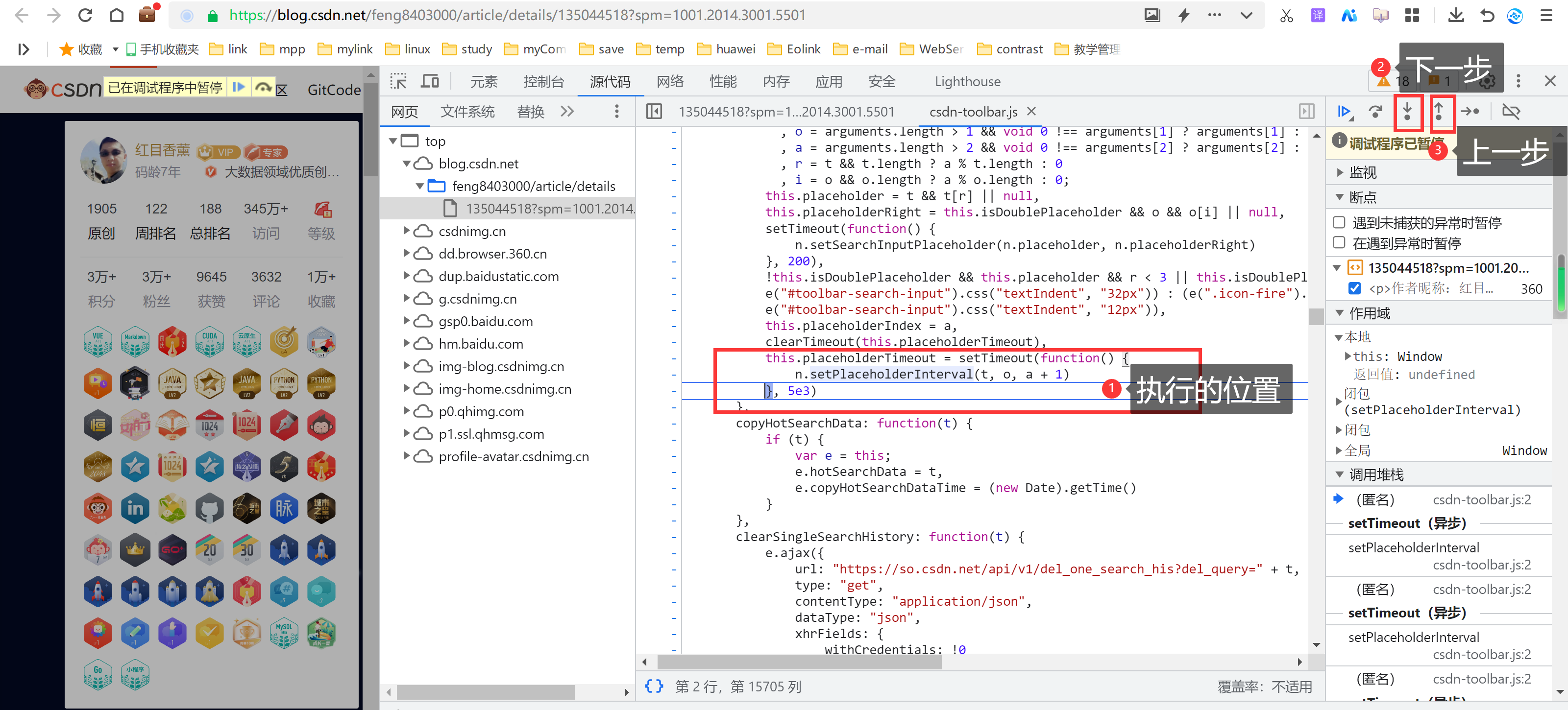 这里要注意,点击debug后是所有的页面都会停下,所以如果浏览器开启了多个页面,点击后其它页面就也会停止。