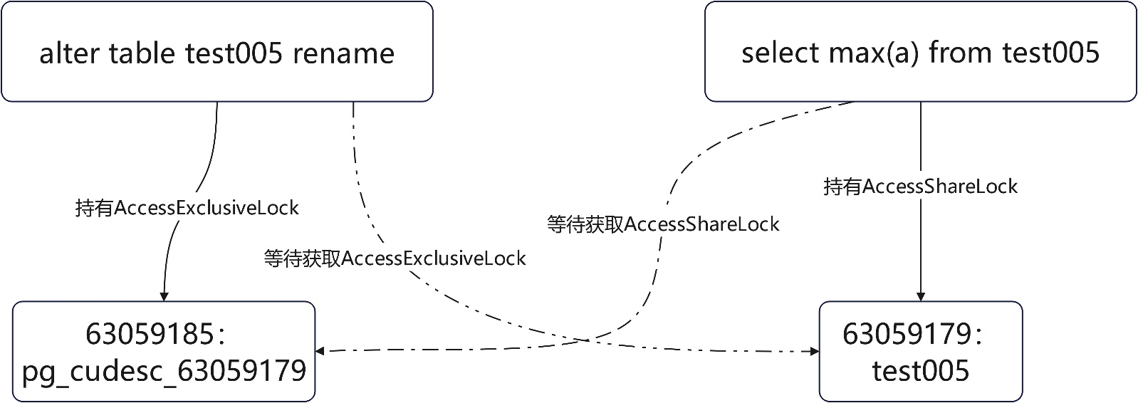 - ACCESS SHARE与ACCESS EXCLUSIVE锁冲突例子:session 1 在事务内对表进行truncate,且lockwait_timeout参数设置为10s;session 2 查询该表,此时会一直等到session 1 释放锁,直到等锁超时。