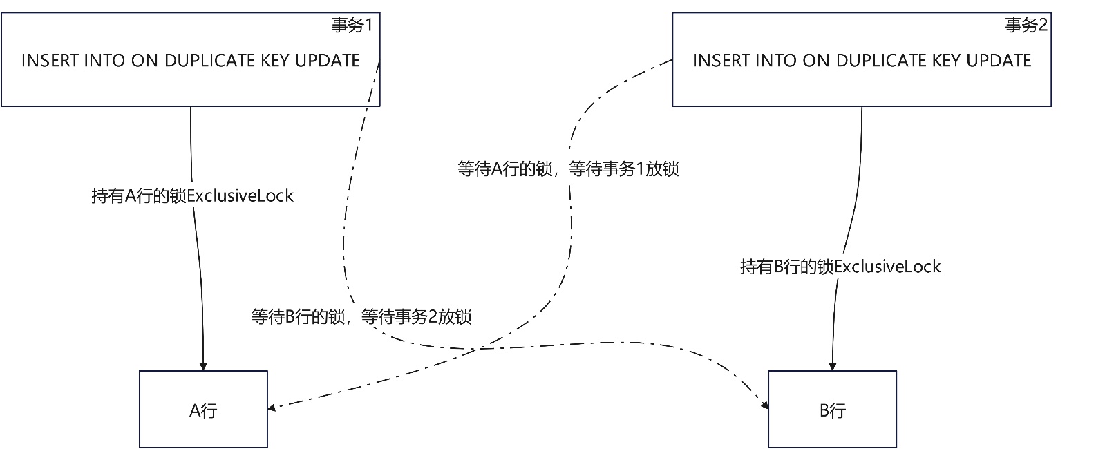 第一时刻:session 1:先拿到lock_table2的8级锁,此时session 2拿到lock_table1的8级锁;第二时刻:session 1:再尝试申请lock_table1的1级锁; session 2 :尝试申请lock_table2的1级锁;两个会话都持锁并等待对方手里的锁释放。