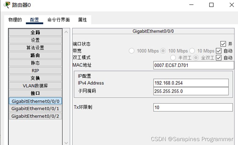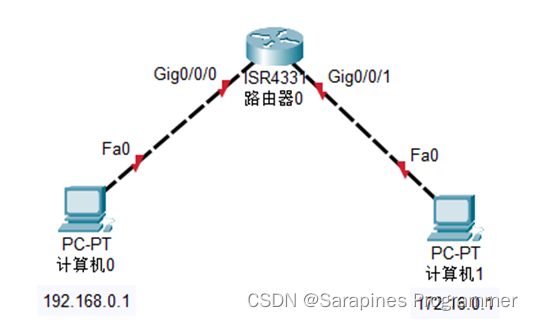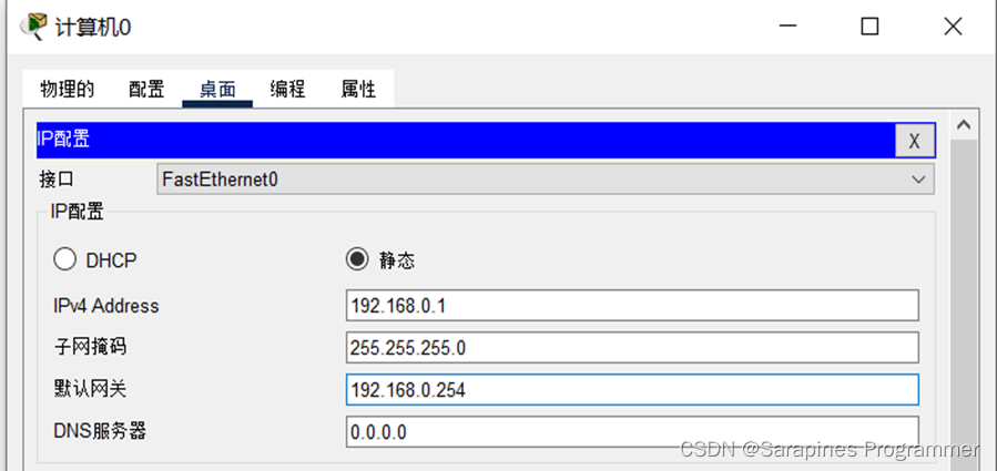 (5)step5 验证不同网络通过路由器能否进行通信:分布配置主机0和主机1的默认网关为192.168.0.254和172.16.255.254.其中主机0的网关地址: