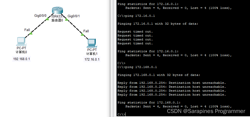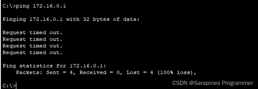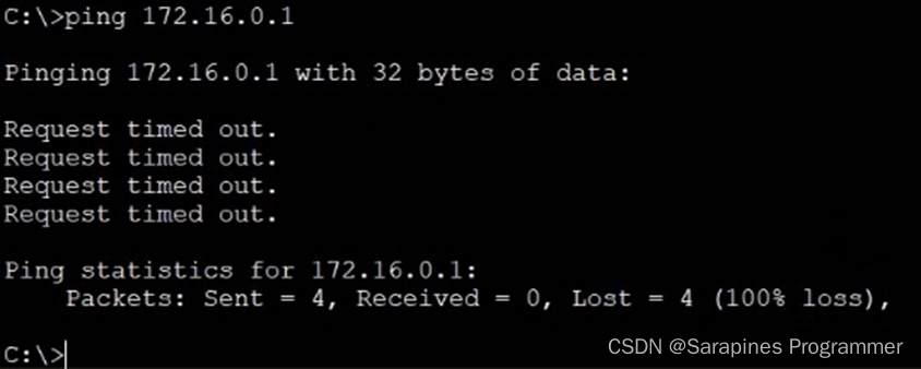 此时若用主机0的命令指示符ping 172.16.0.1仍然会显示超时,这是因为主机0和主机1不在同一网络,而对路由器也并未指明其传输的地址: