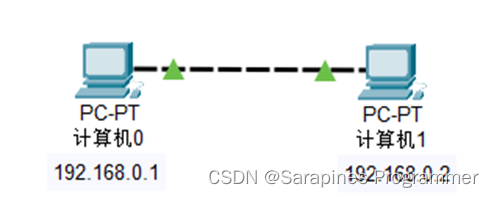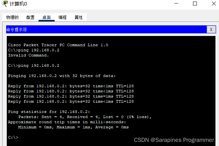 (3)step3 验证主机间能否进行通信:打开主机0的命令提示符输入ping 192.168.0.2,得到主机1的响应,表明在同一网络号可进行通信。