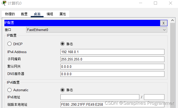 (2)step2 设置网络设备(设置主机的IP地址):鼠标左击PC-PT计算机0,选择桌面点击IP地址设置为192.168.0.1,系统会默认填充子网掩码,并对主机01设置IP为192.168.0.2,设置主机01的IP地址: