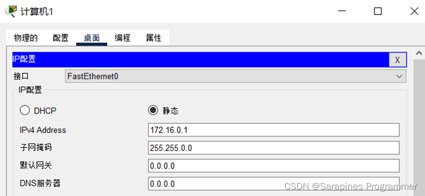 更改主机1的IP地址设置为172.16.0.1,网络号为172.16属B类网络,而主机0属于C类网络,两者不在同一网络,主机1的IP地址: