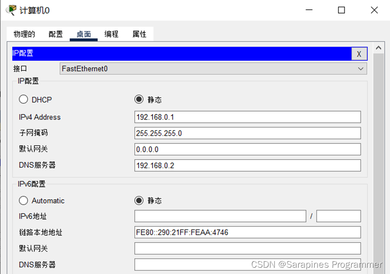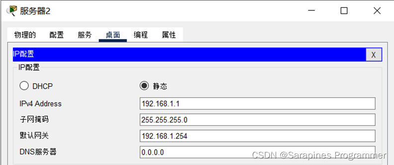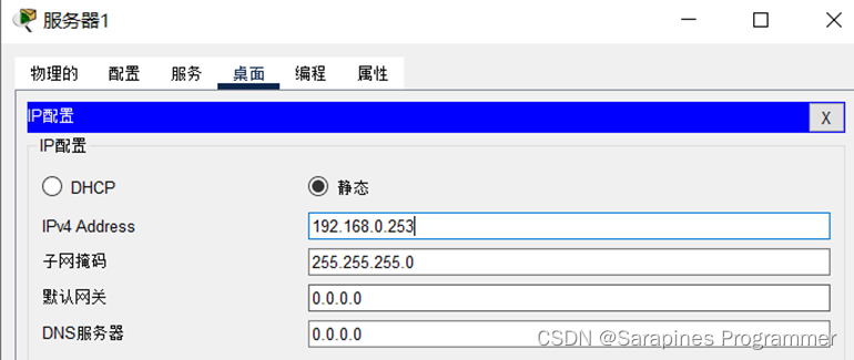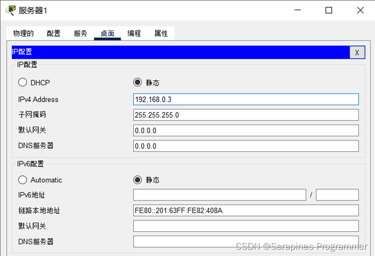 (2)step2 设置网络设备:鼠标左击服务器1,选择桌面点击IP地址设置为192.168.0.3,默认子网掩码为255.255.255.0,默认网关为0.0.0.0。