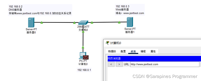 (4)step4:从实时模式切换到仿真模式,只显示DNS与HTTP。打开PC0的网页浏览器,输入www.porttest.com,此时由主机0向DNS服务器发生了一份数据包。