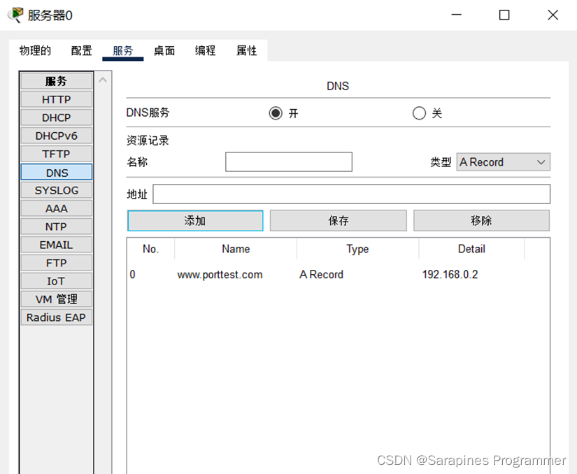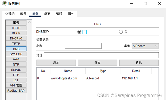配置DNS服务器,鼠标左击DNS服务器,选择桌面点击IP地址设置为192.168.0.2,默认子网掩码为255.255.255.0,默认网关为0.0.0.0。