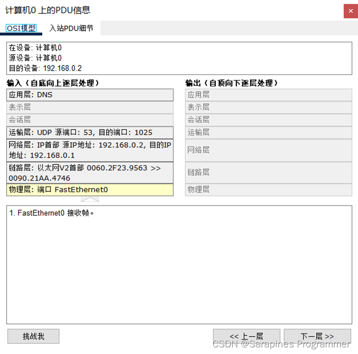 点击PC0上的数据包,可以看见具体封装的PDU细节.
