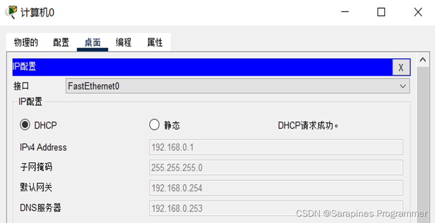 打开主机0的IP地址设置,选择DHCP配置,显示DHCP请求成功结果: