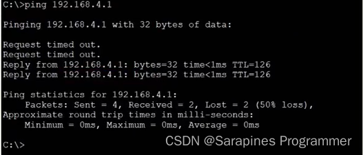 可以分析发现出现两次超时还有两次响应,说明主机1一共向主机4发送了四个数据包。重新使用主机1 ping 主机4可以发现四次都收到了主机4的响应: