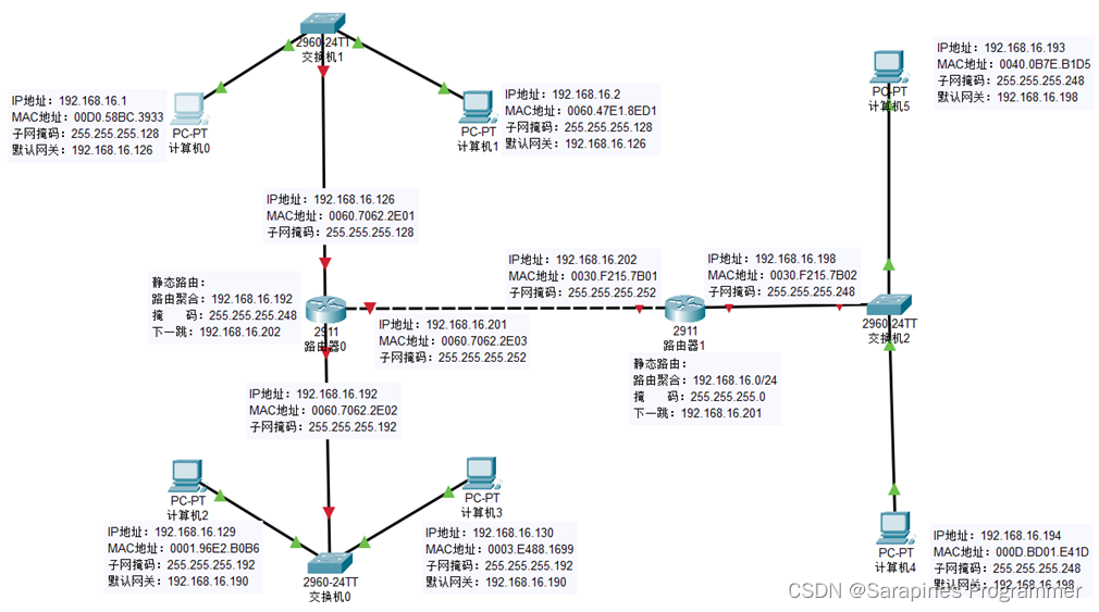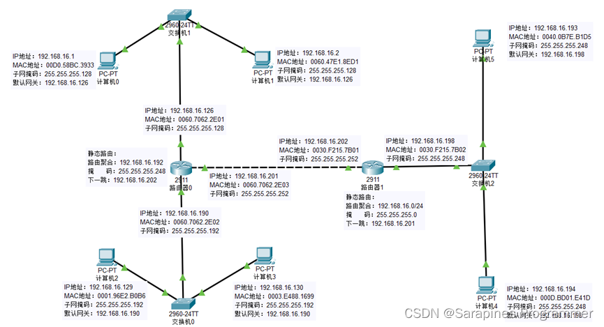(1)step1 构造网络拓扑:在逻辑工作空间选择6台主机(此处拖动的为主机)、2台2911路由器(存在三个接口)、3台交换机及连接线(此处拖动的为自动选择连接线类型),构造网络拓扑: