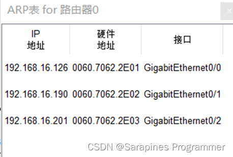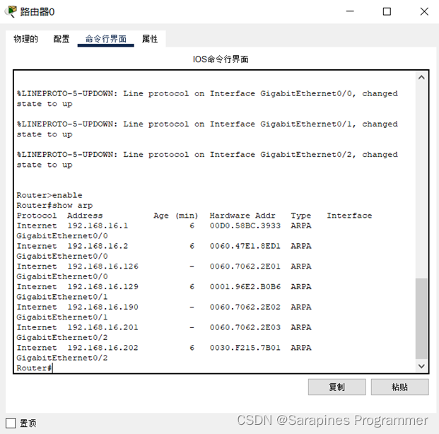 打开路由0的命令提示符输入enable再输入show arp,得到路由0的ARP表响应:
