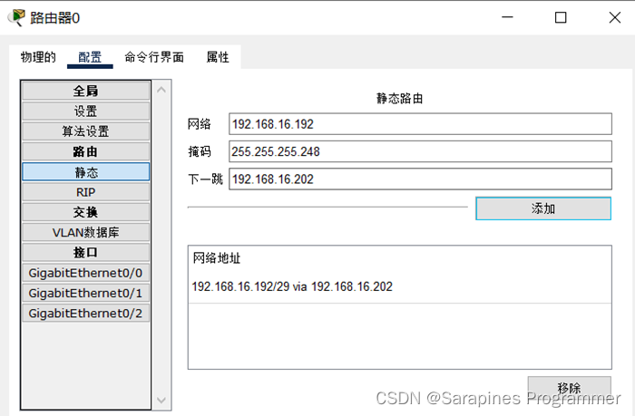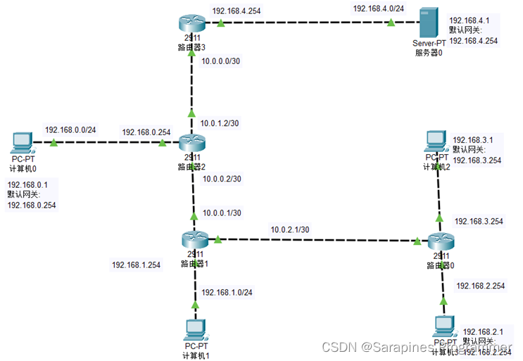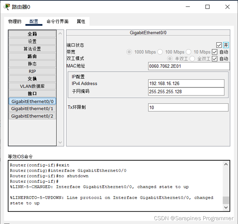 配置路由器0的接口0,并打开端口状态,其余接口与其他路由分别按前述标注进行配置。其中路由0的设置: