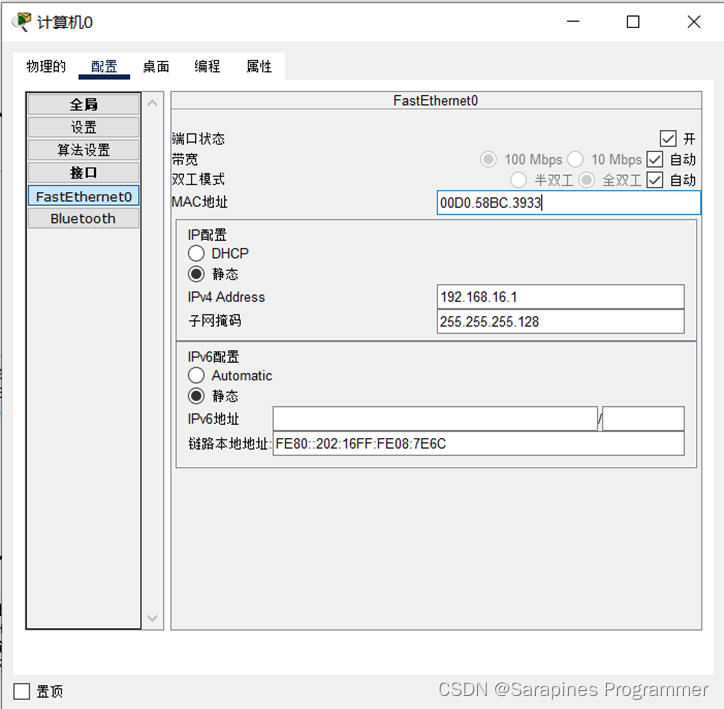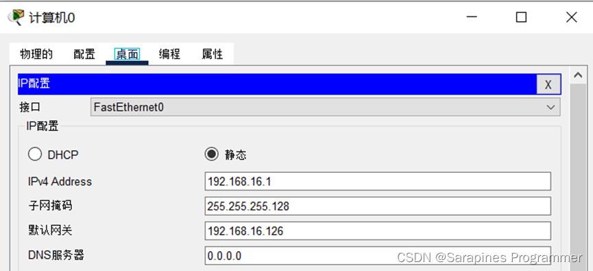 (2)step2 设置网络设备:鼠标左击PC-PT计算机0,选择桌面点击IP地址设置为192.168.16.1,填充子网掩码为255.255.255.128,默认网关为192.168.16.126,MAC地址为00D0.58BC.3933。按照前述设置其他网络设备。