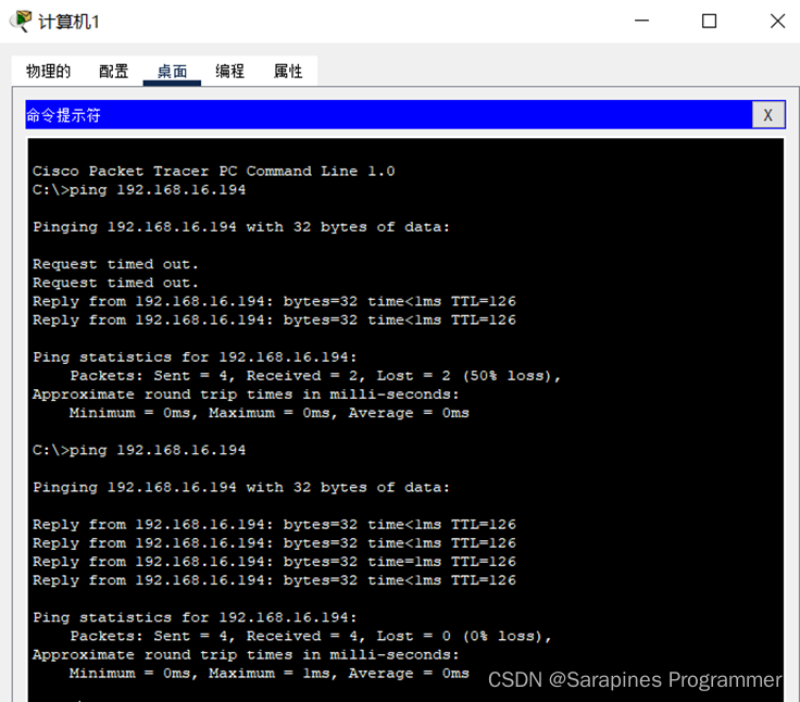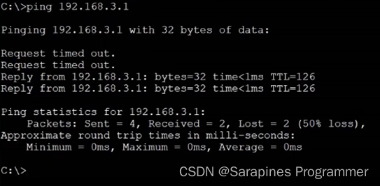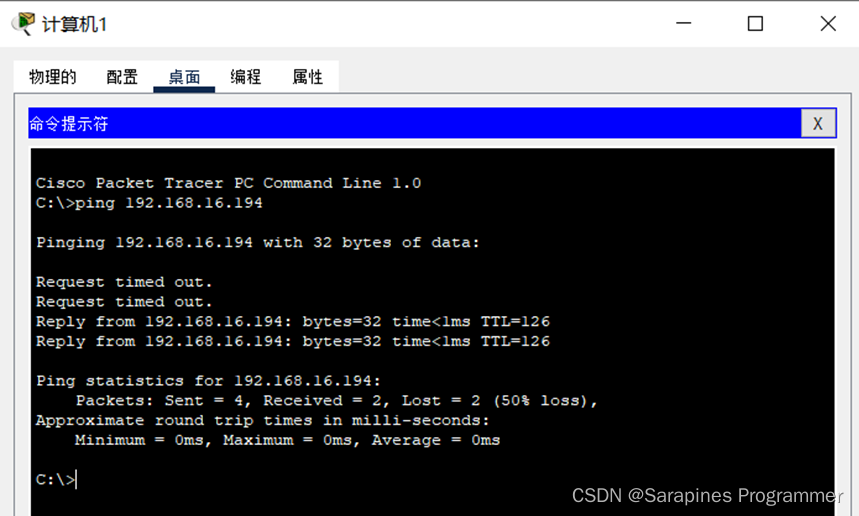 (2)step2 验证主机间能否进行通信:打开主机0命令提示符,采用ping 服务器的方式验证能否进行通信: