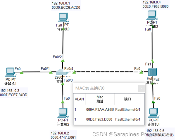 (7)step7数据碰撞1:通过主机0、主机4分别向主机2、主机5传输数据包,在集线器(上)组成的局域网,主机0的ARP高速缓存表: