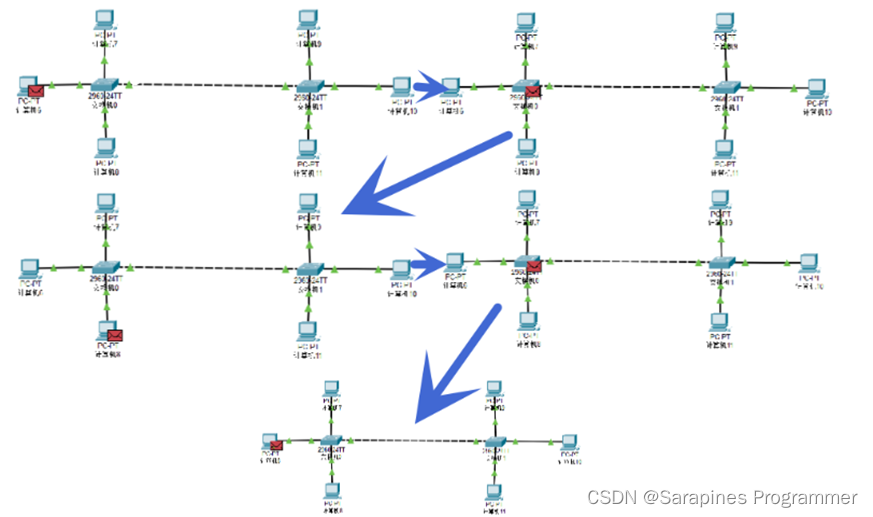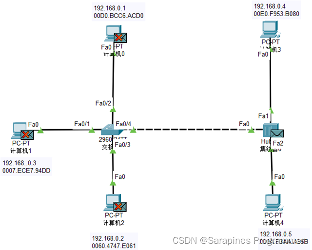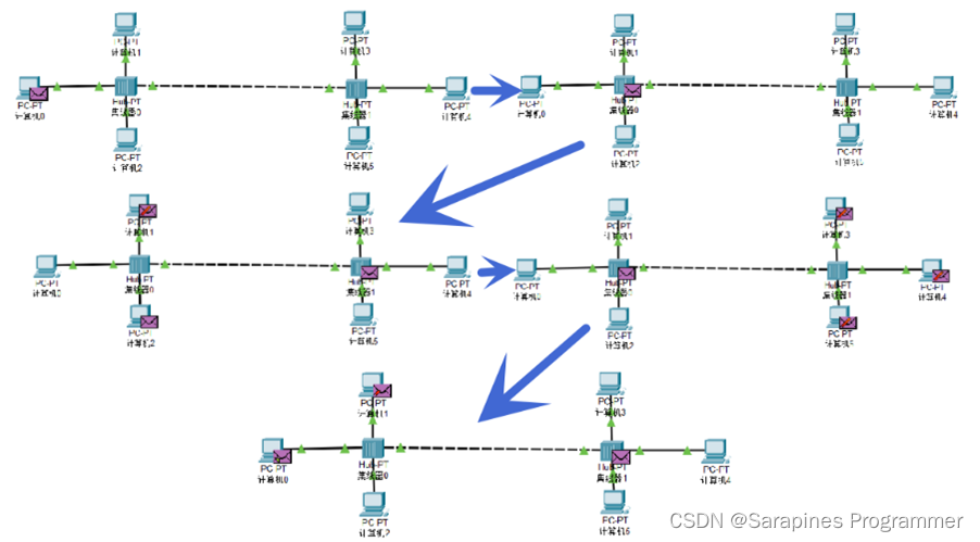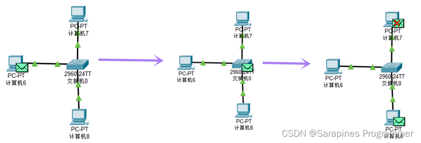 我们发现一个在集线器组成的局域网中数据包的传输会经过每一个主机,而交换机组成的局域网中数据包传输类似定向传输。