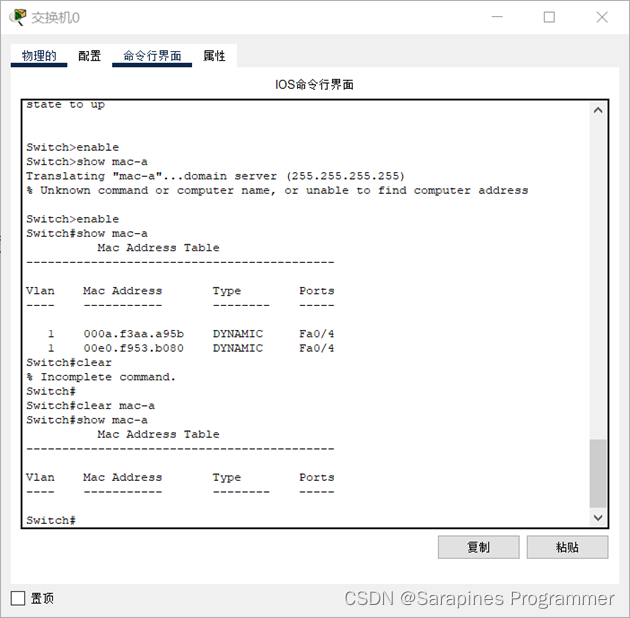 (4)step4 操作交换机的命令行界面:通过打开交换机的命令行界面回车输入enable进入课程模式,输入show mac-a查看交换机登记的MAC地址,同时可以使用clear mac-a清除记录。
