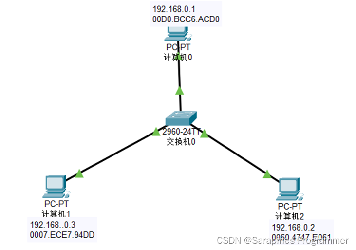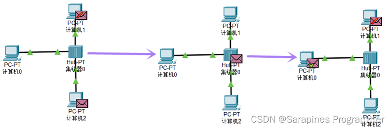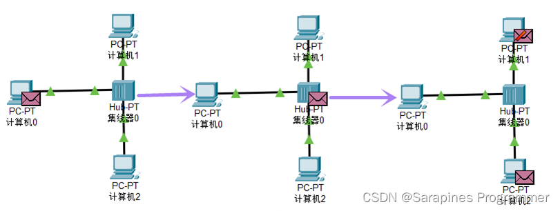 首先,数据包由主机0发送到集线器,接着,集线器将其广播发送给主机1和主机2,最后,主机1收到报文后检查报文的目的MAC地址,与主机1网卡不同因此拒绝接收,同理主机2收到检查发现与报文MAC地址匹配故接收成功,并且主机2给发送方返回发送响应: