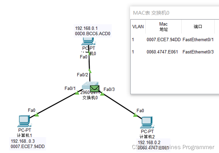 (8)step8数据碰撞2:通过在集线器局域网添加交换机形成新的局域网,验证碰撞率是否增大。主机0的ARP高速缓存表: