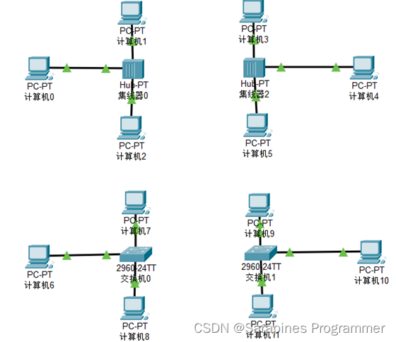 (1)step1 构建四个以太网:在逻辑工作空间选择12台终端设备(此处拖动的为主机)、12条连接线(此处拖动的为自动选择连接线类型)以及两台交换机和两台集线器,构造网络拓扑: