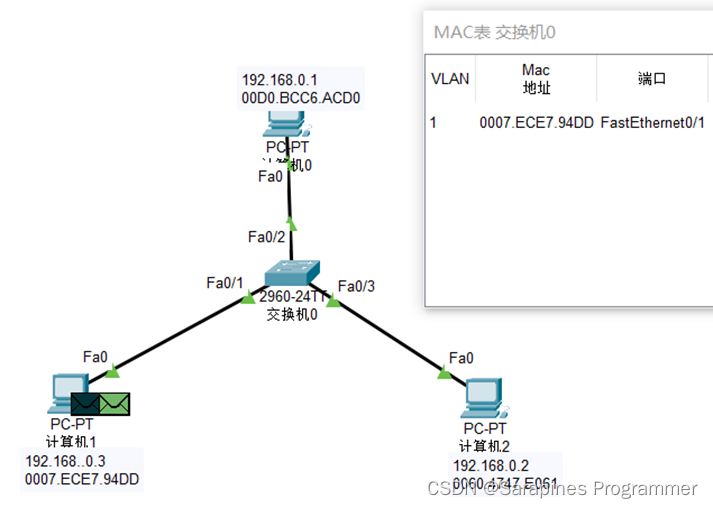 显示发现此时交换机MAC和端口信息都关于主机1,此时交换机将ARP广播给主机0和主机2,由于主机0的ARP不匹配因此不接收,而主机2接收成功,并且返回响应,在交换机留下相应的MAC地址和端口信息,交换机的信息更新: